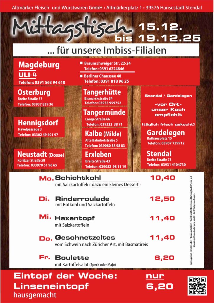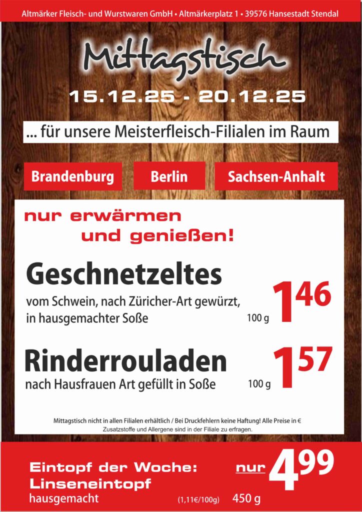 Das Mittagsangebot vom 15. Dezember bis zum 20. Dezember 2025: